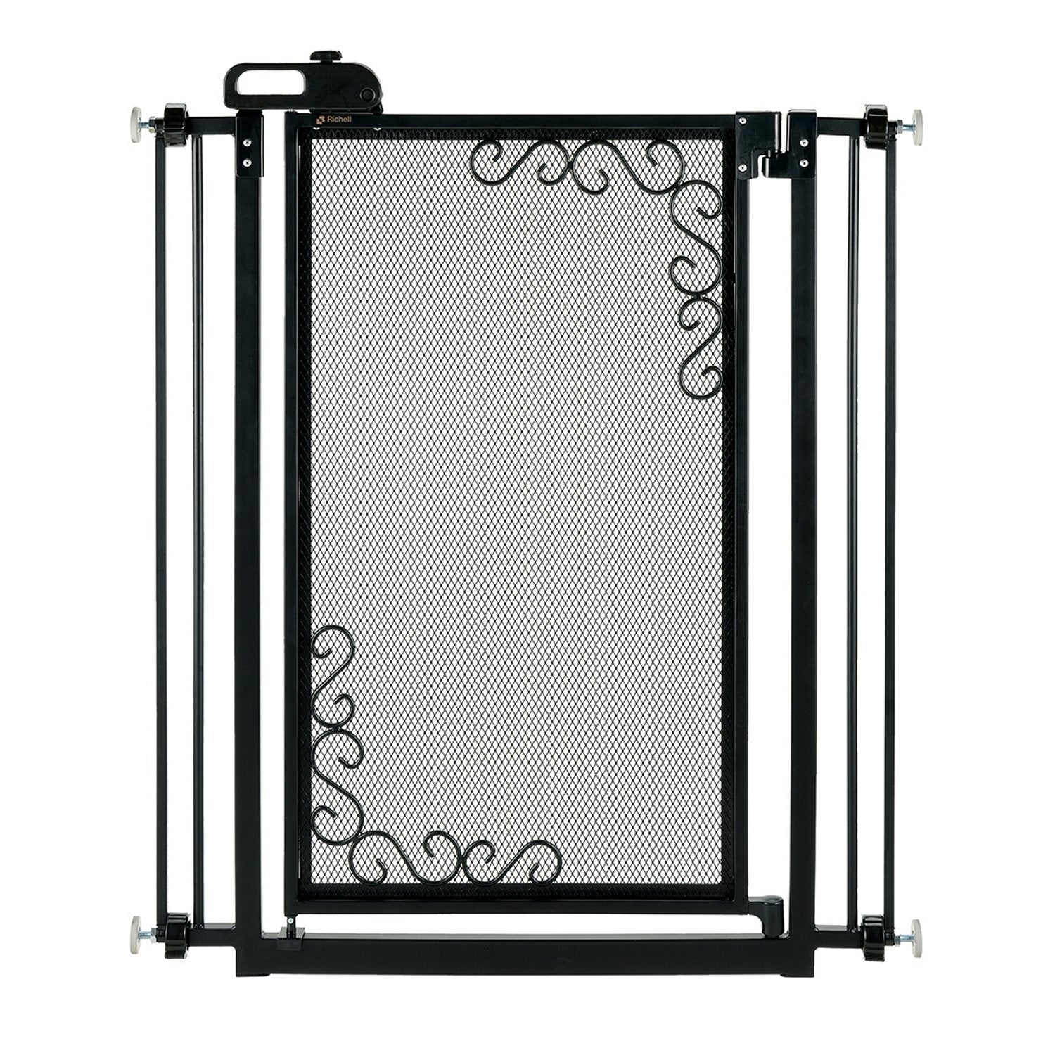 Crafted of durable metal and featuring an exquisite mesh screen, our Tall One-Touch Metal Mesh Pet Gate has a new luxurious look! The tension-mount gate design stays firmly in place without damaging wall surfaces. The single button, easy lifting door handle allows for the smooth opening of the mesh door in either direction with just one hand. Easily carry items in one hand while opening the gate with the other. Add both ease of use and style to your home décor with the Richell Tall One Touch Metal Mesh Gate. This functional work of art comes in either Black or Antique Bronze.