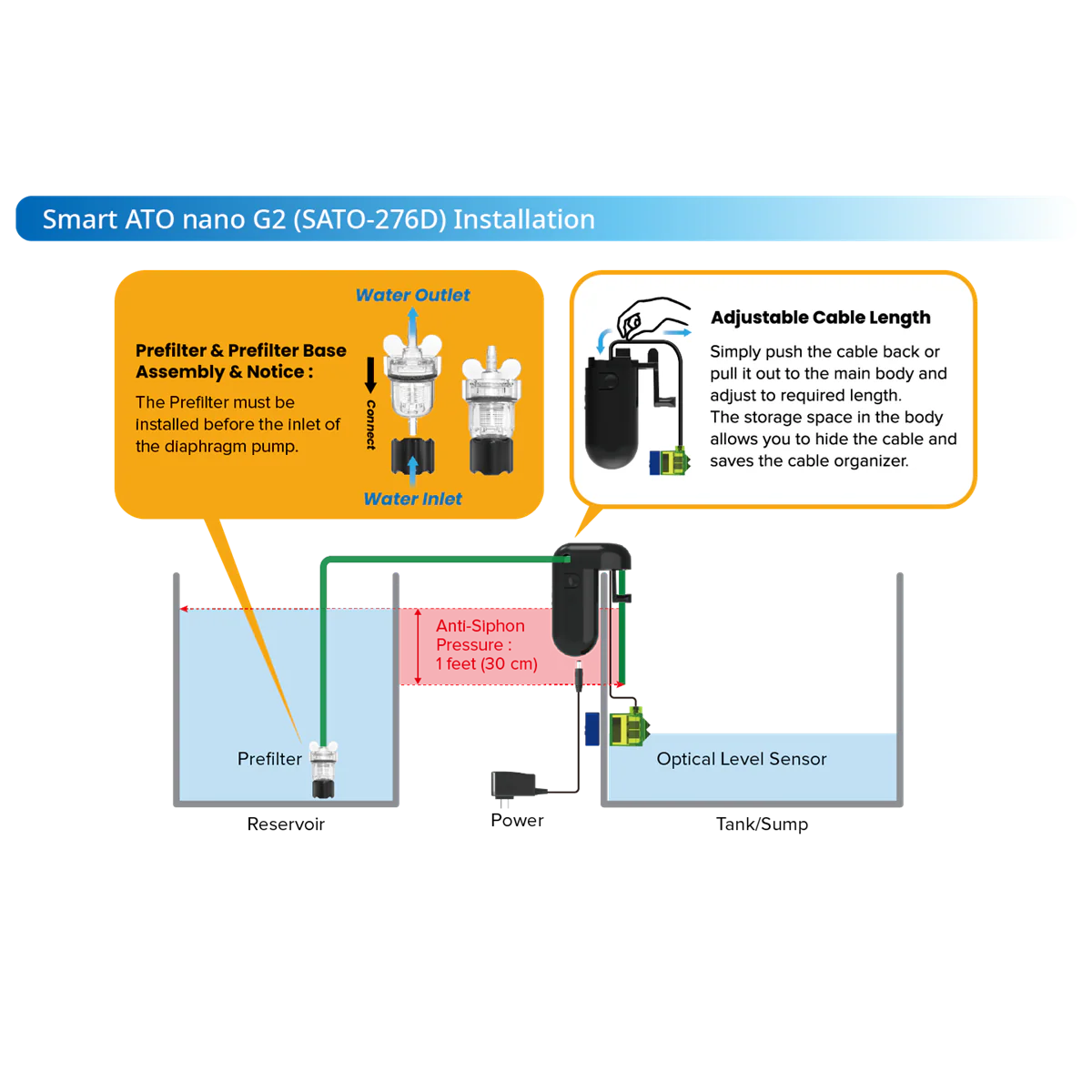 Integrated with Square Dual Sensor and built-in Anti-Siphon Diaphragm Pump provides efficiency, silent, and precise ATO process. It is extremely easy to install it on your aquarium— hang on tank, connect the tube, and plug and play.