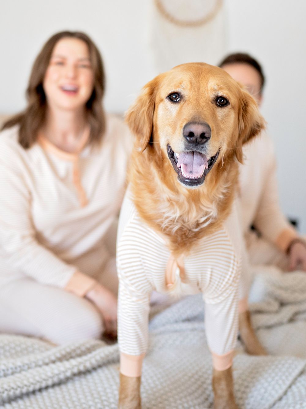 Simple, sweet, gender-neutral PJ set for you + your fur love. Made from a soft and stretchy cotton blend fabric in a light salmon and ivory stripe.