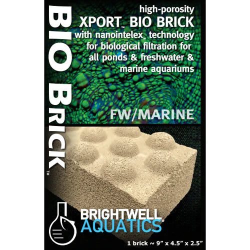 Instructions and Guidelines: Use one XPORT Bio Brick for every 1,000 U.S. gallons (3,800 L ) of system capacity, more for heavy bio loads. Rinse material well with aquarium water or purified tap water. For superior results, seed the material using MicroBacter7 aquarium, by placing XPORT BIO BRICK in a plastic container, filling it with aquarium water, and then adding the full recommended dose of either bacterial product, based on the size of your aquarium, to that container. Allow to stand overnight and then add the seeded XPORT Bio Brick to your system. You may also add the water back to your aquarium, if desired. It is recommended that you use sponge, fine filter floss or other mechanical filtration ahead of XPORT Bio Brick to prevent clogging with organic material. For maximum results, also provide a good carbon source for growing bacteria, such as Brightwell Katalyst bio pellets or liquid Reef BioFuel, as appropriate for your aquarium, as directed on their label.