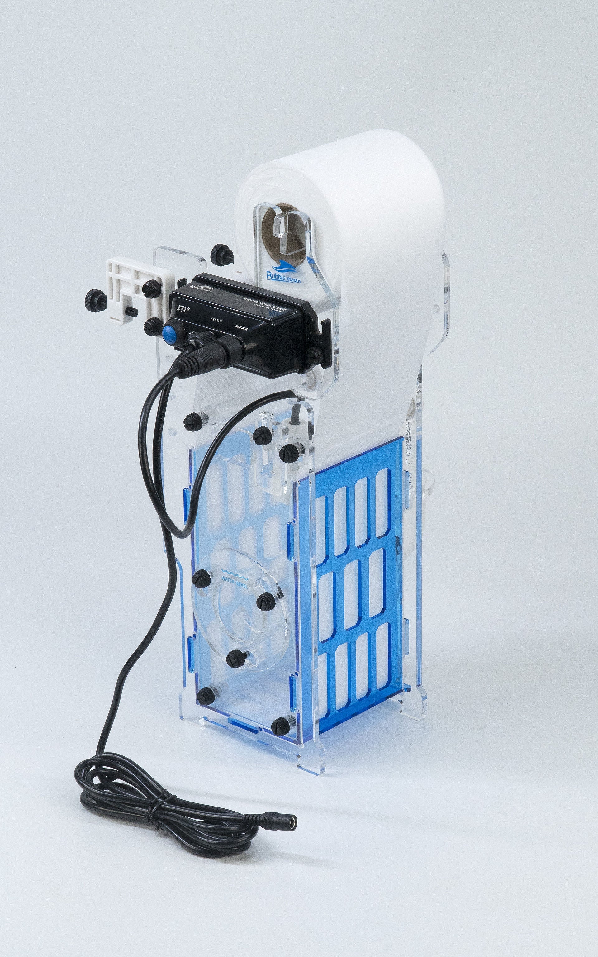 The ARF-S G2 removes the need for filter socks. Water is fed into the internal chamber via the aquarium systems drain, and through the filter roll. When the water level rises in the chamber due to filter clogging the water level switch triggers the motor to wind on the filter roll to a new fresh piece. The water level will then drop repeating the process