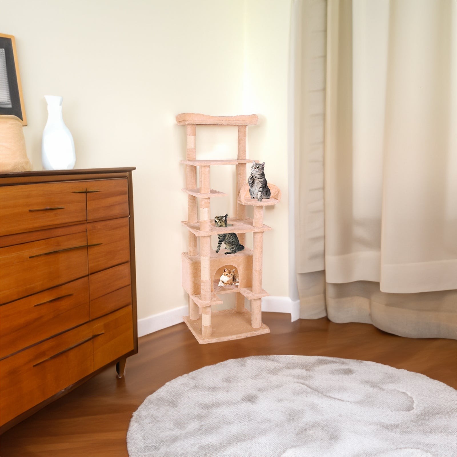 【Pet-friendly Materials】Crafted from pet-safe manufactured wood and covered with soft plush fabric, this tall cat tree tower offers a secure living and play space for your beloved pets.