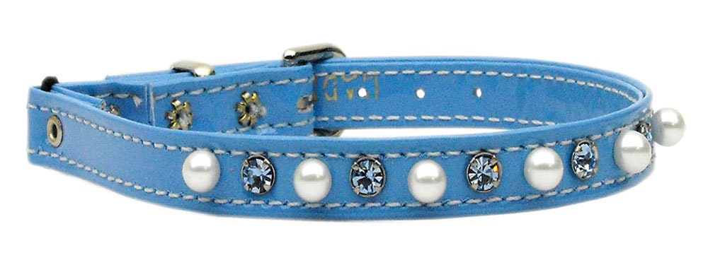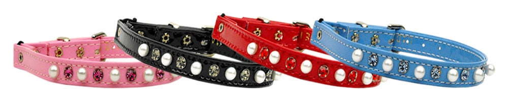 We love the jewels and pearls on this cat safety collar! This glistening ⅜" wide patent faux leather cat collar with stretching safety elastic band is enhanced with one row of alternating pearls and rhinestone crystals.