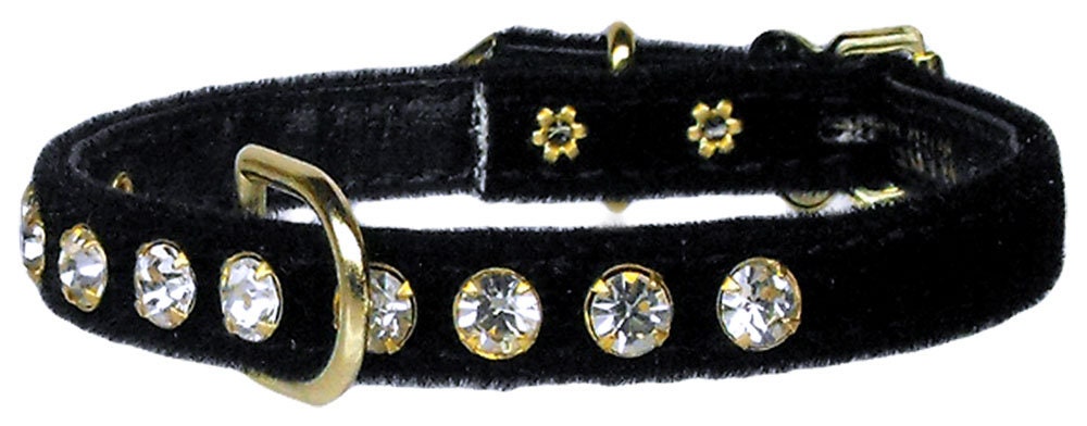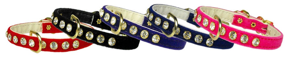 Simple yet elegant! These 5/16" wide collars are made from our wonderful velveteen material and come with one row of clear prong-set rhinestones, and a center D-ring for a leash to attach. This collar is available in an array of sizes and colors.