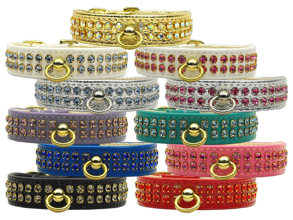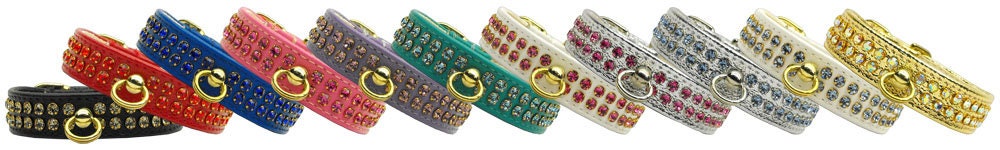 We love the sparkling crystals on this dog collar! This ¾" wide collar is jeweled with two stunning rows of prong-set rhinestones, and comes with a center post where an I.D. tag can be attached. This collar is available in an array of sizes and colors.