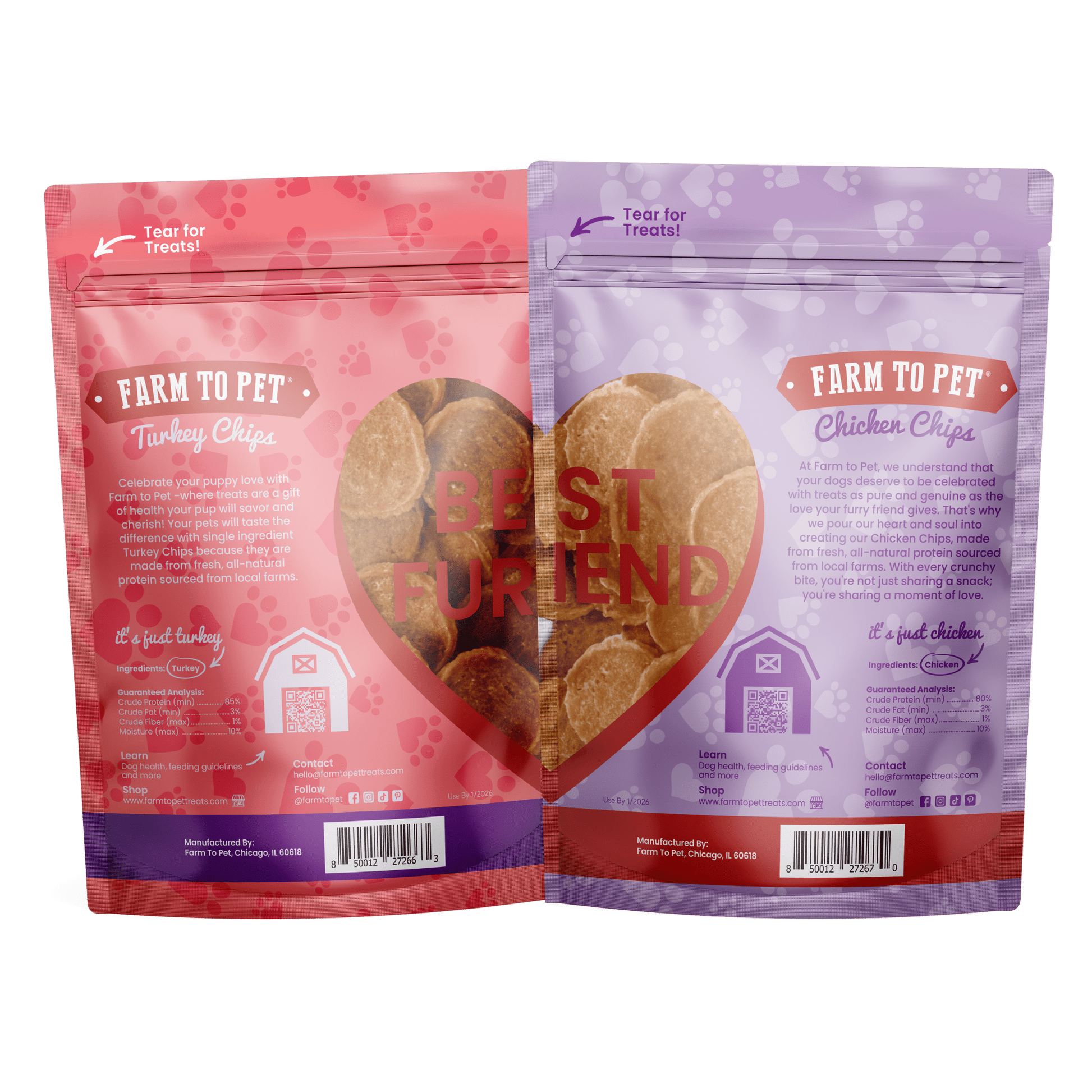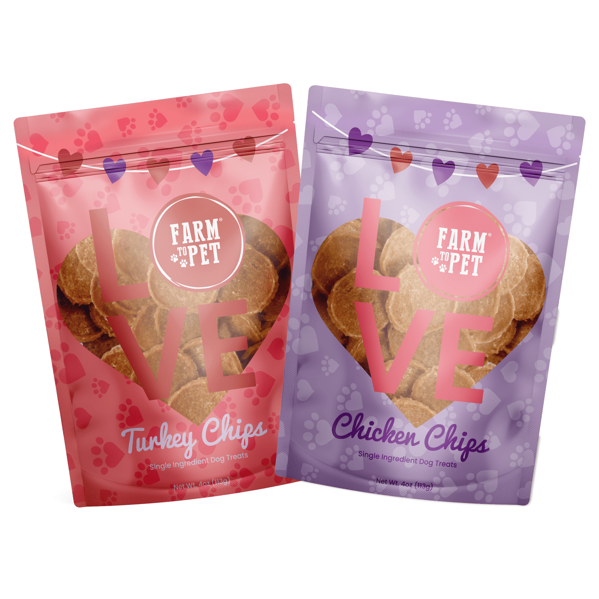 Spread the healthy pet treat love with Farm to Pet's Dogs Love Chips Bundle! Packed with wholesome goodness, this perfect pairing features matching bags of our Chicken and Turkey Chips too cute not to share as dog gifts. The fresh, all-natural poultry without any additives will make tails wag - and motors purr! - with delight after each crunchy bite, as you beam with love for your best fur-riend.