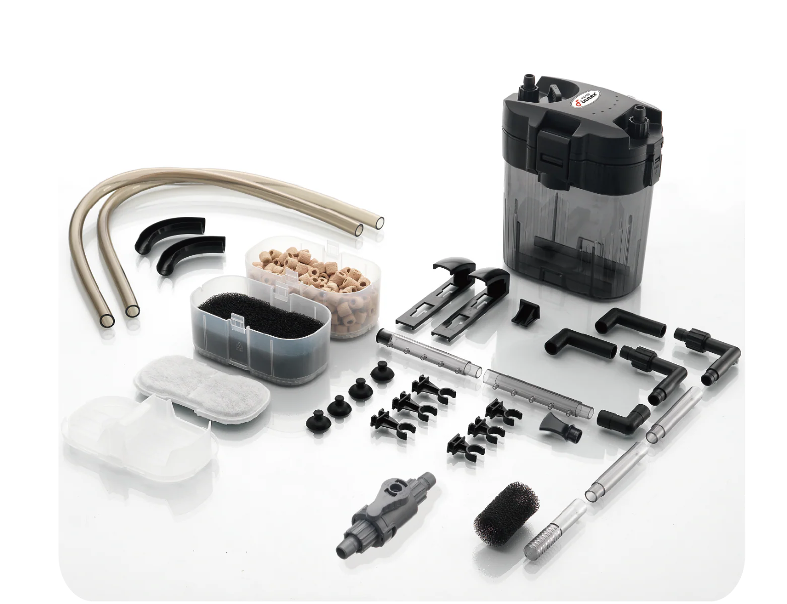 The Finnex PX-150 is the updated successor of the popular PX-360 compact aquarium canister filter. Key upgrades include an updated motor allowing a max flow rate of 150 gallons per hour. Great for aquariums now up to 30 gallons. For those with smaller aquariums, the PX-150 canister filter includes a flow control valve allowing users to fine-tune to a flow rate most ideal for their specific setup. Like the original PX-360 canister aquarium filter, they both offer a vacuum tight force filtration that out performs conventional power filters as your tank will become noticeably cleaner and clearer. Quiet operation and easy maintenance make this filter an ideal setup for salt water or fresh water aquariums. Enjoy easily removable filtration chambers to add or remove any media you choose. Media Upon Media Filtration media includes activated carbon floss pad, sponge, and ceramic rings. Easy removable filtration media holding trays makes maintenance easy. Completed accessories include durable water intake strainer, spray bar, and filter hanger. High-quality ABS material constructed canister body. Hooks included if one would like to hang the canister on the back of an aquarium.