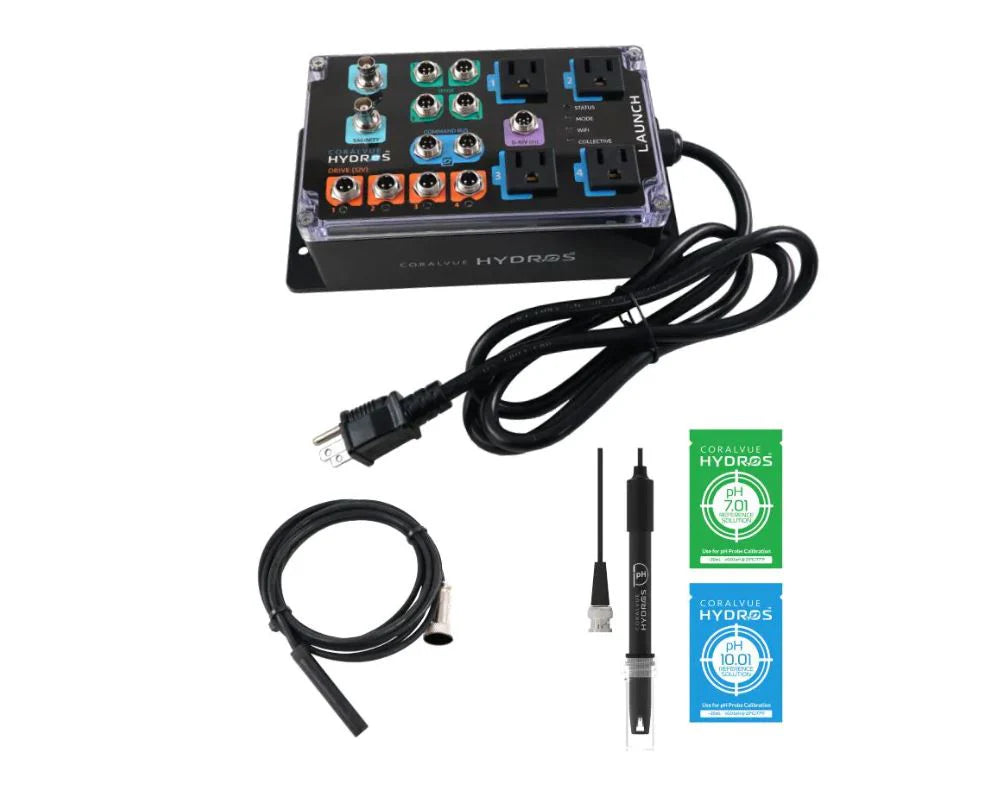 The HYDROS Launch is a multifaceted aquatic support system that combines various features into a single controller. It's an all-in-one solution that allows you to manage a wide range of aquarium functions easily. The HYDROS Launch includes a pH or ORP port, a salinity probe port (salinity probe sold separately), four universal sense ports, four 12V drive ports, 0-10V input control, and four controllable AC Outlets built directly into the controller. It's a great starting point for anyone entering the HYDROS platform.