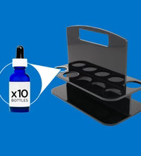 Durable acrylic bottle caddy holds ten 37mm diameter bottles and includes four 25.5mm diameter reducers for smaller bottles.