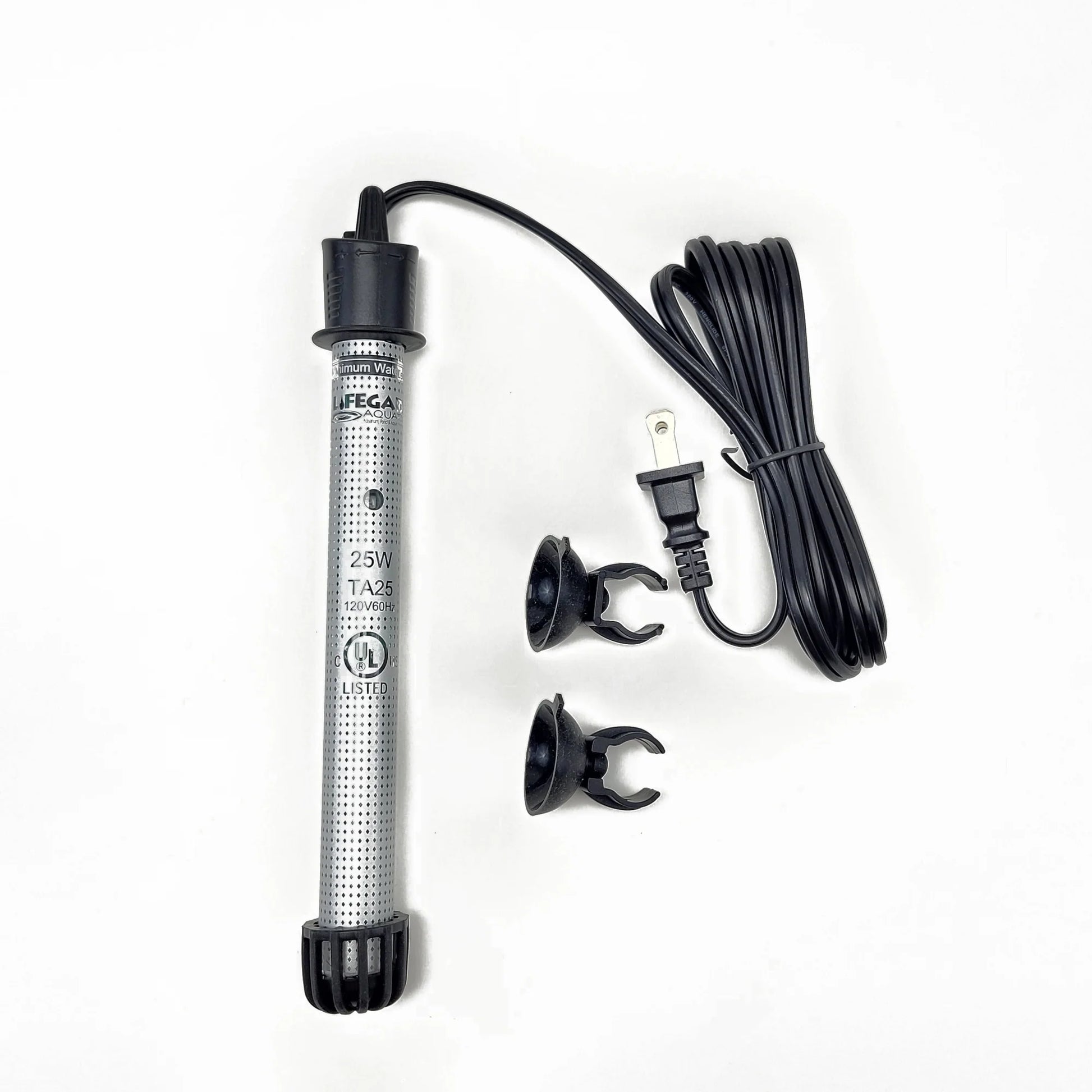 Submersible Shatterproof Quartz Heater safe for Freshwater and Saltwater tanks. Easy to set thermostat features LED Power Indicator Light showing operation. 120V/60 Hz energy efficient operation. Quartz Glass tube, 6’ cord and suction cup mounting brackets.