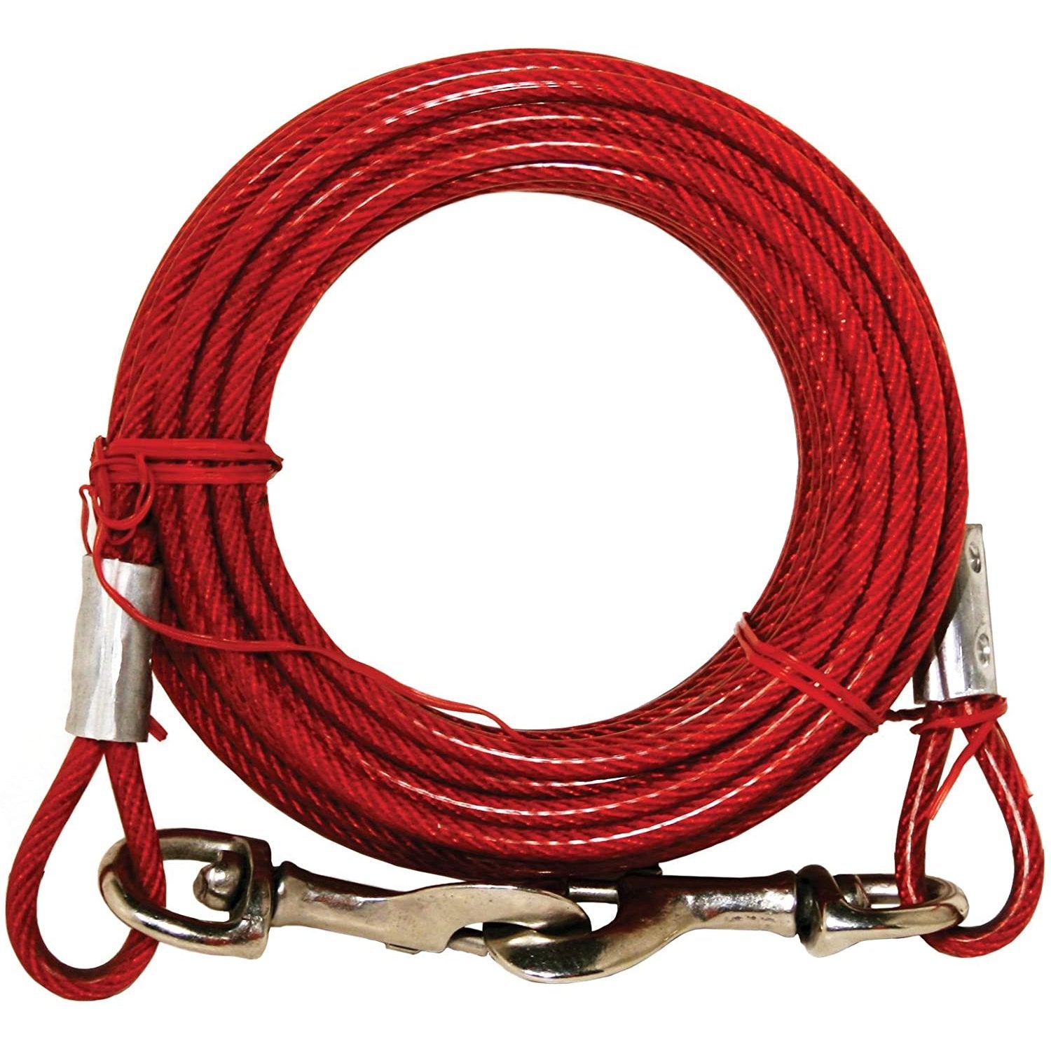 Prevue Pet Products medium-duty 20Æ tie-out cable 2120 is designed for dogs up to 65 lbs. Medium duty, galvanized aircraft-grade wound-steel cable is housed within crack-resistant, high visibility Red vinyl casing to ensure your dog stays safe and secure. Premium quality die-cast iron swivel bolt snaps at both ends to connect easily. Medium duty tie out cable is 20 foot long with a 3.3 mm diameter wire cable; 4.8 mm in vinyl casing.
