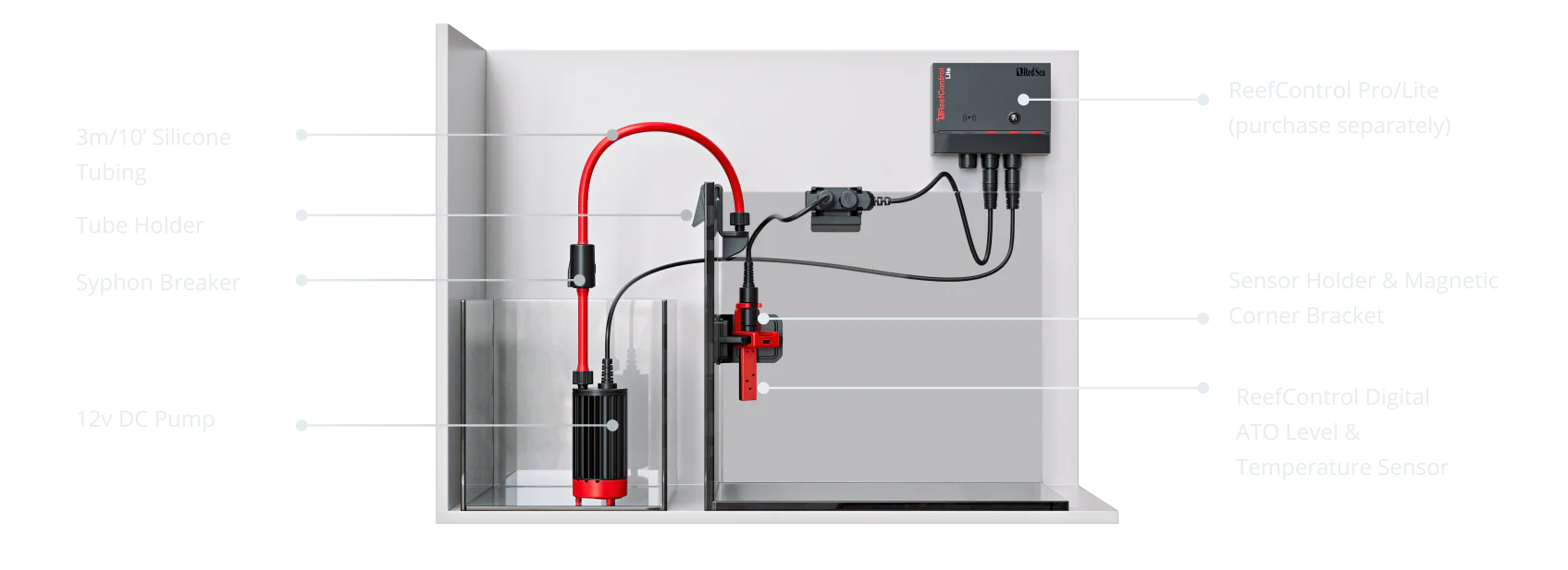 The digital ATO sensor and dc pump of the ReefControl ATO module connect directly to the ReefControl Pro or Lite to seamlessly add a fully featured ATO to your system without the need for an additional controller. (Controller sold separately)