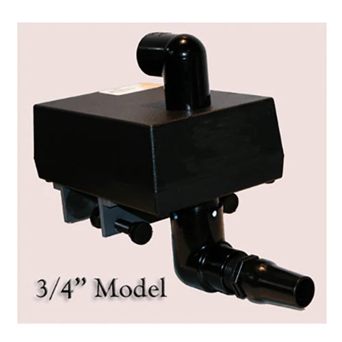 The 3/4" model will flow approximately 850/950 GPH man. The total height with the fitting attached on top is 4.5". Now supplied with the heavy duty 24V AC motors and US wall adapter. Standard bracket assembly supplied fit's glass tanks with tank frame width of 1-5/8" max.