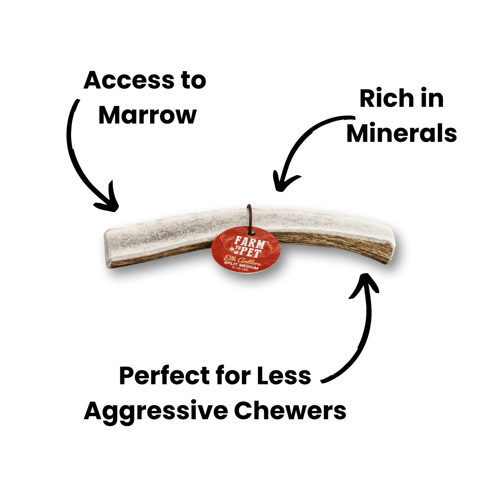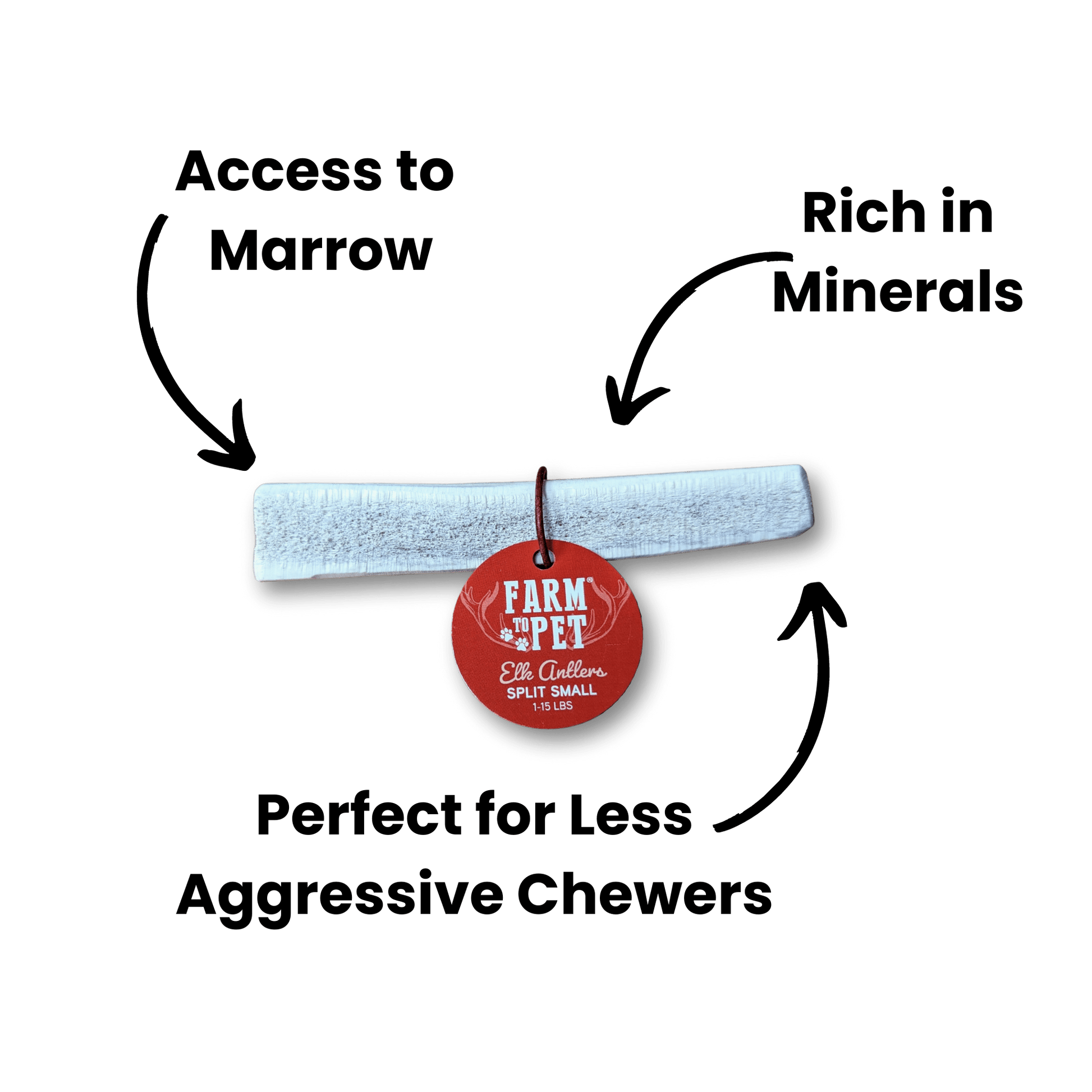 All Farm to Pet elk antler dog chews offer nutrition, durability and chewing satisfaction. It's the level of effort to reach the marrow reward inside that varies! A split elk antler for dogs is our "easiest" chew, still tough but slightly softer than deer and reindeer antler chews and with the marrow exposed for instant gratification. This also makes it ideal for puppies (after they have lost their milk teeth) and inexperienced chewers. Unsure which chew is right for you? Take our Antler Quiz for a suggestion based on your dog.