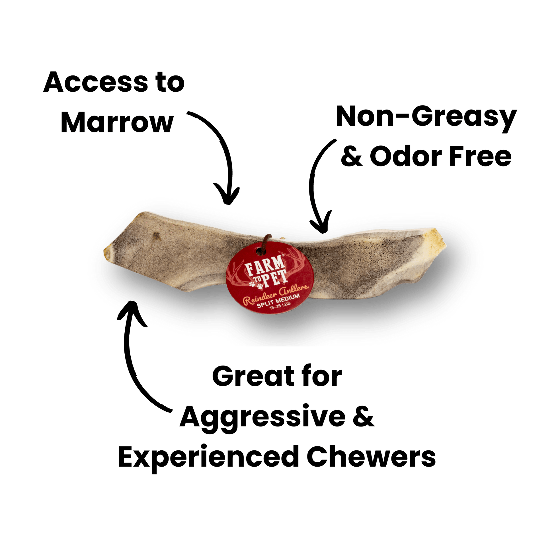 Farm to Pet's Split Reindeer Antlers for Dogs provide furry chewers with the enjoyment and nutrition of their whole counterparts in less time! Still an extremely durable organic dog chew, split reindeer antler sheds for dogs reward with marrow flavor from bite one. These odor-free organic dog chews also promote physical and mental wellbeing, relieving anxiety and burning energy with every chomp!