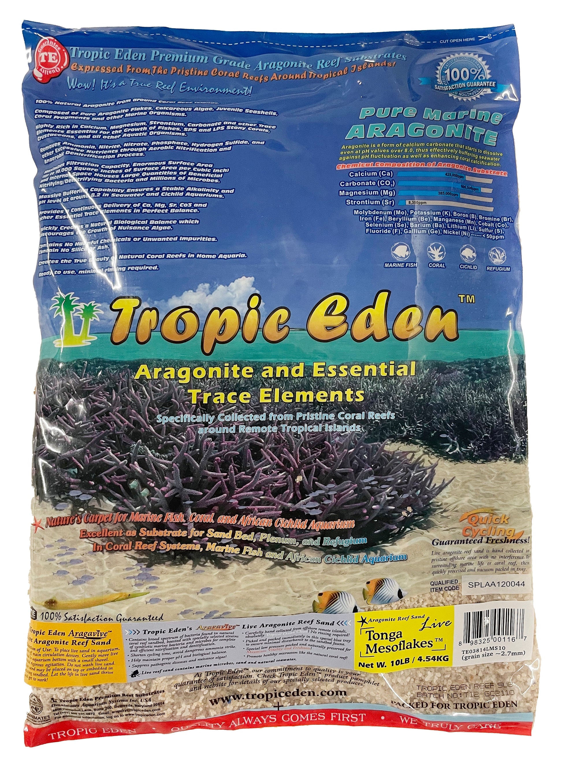 Tropic Eden Premium Grade Aragonite Reef Substrates are TRUE marine originated aragonite. Unlike calcium carbonate oolite which forms at the interface of cool and warm oceanic currents, Tropic Eden's aragonite reef substrates consist of REAL calcareous algae, juvenile seashells, foraminifera shells, coral fragments, and other marine calcareous organisms. Because these materials are the remains of marine organisms, they contain all of the essential elements necessary for the growth of marine organisms.
