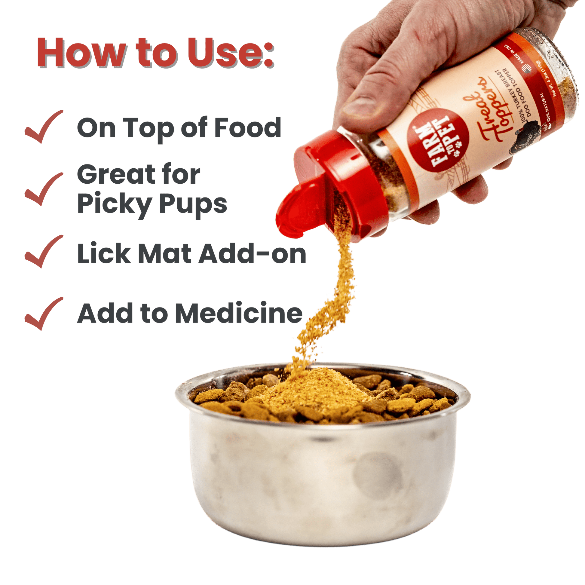 Every serving of Farm To Pet Turkey Treat Topper provides all-natural nutrition and flavor pets love. Just use this powdered version of our pure protein, low-fat Turkey Chip treats as a wet food or kibble topper, mix into recipes or medicine, or pour into a bowl or licking mat. Even picky eaters and pets with chicken sensitivities will gobble it up - and so will cats!