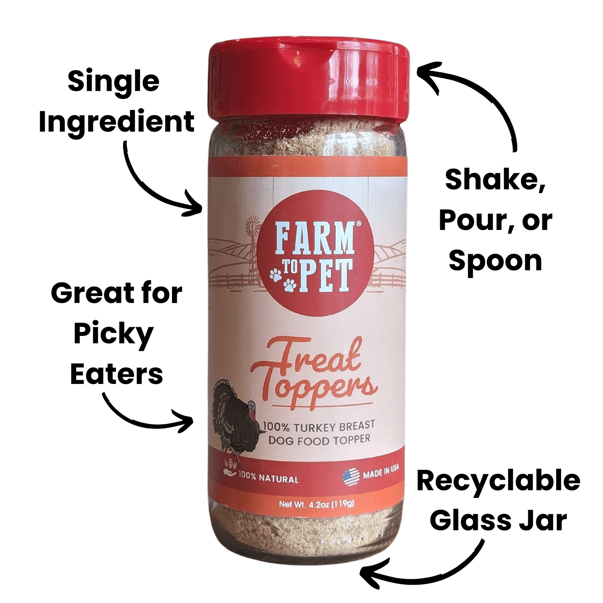 Like all Farm to Pet products, our Treat Topper is more than a treat. Yes, it's literally made of our Turkey Chip treats, but just like those crunchy chips, this perfect dog and puppy food topper is brimming with essential nutrients. Not only do vitamins B3, B6 and B12 abound in turkey breast, but so do minerals like selenium, zinc and phosphorous. Together, these nutrients promote healthy metabolism, energy levels and overall furry-friend wellbeing in both dogs and cats!