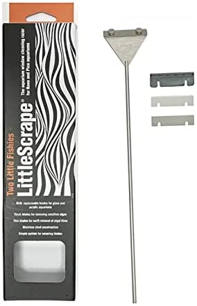 The Two Little Fishies Little Scraper is an advanced 10.25" aquarium window cleaning razor. It includes two replaceable stainless steel metal blades for glass aquariums and a plastic blade for acrylic aquariums. The thick blades are for the removal of hard crusts or coralline algae from windows. The thin blades are for the swift removal of algal films. The blades are held securely in place with two metal screws.