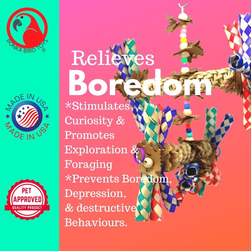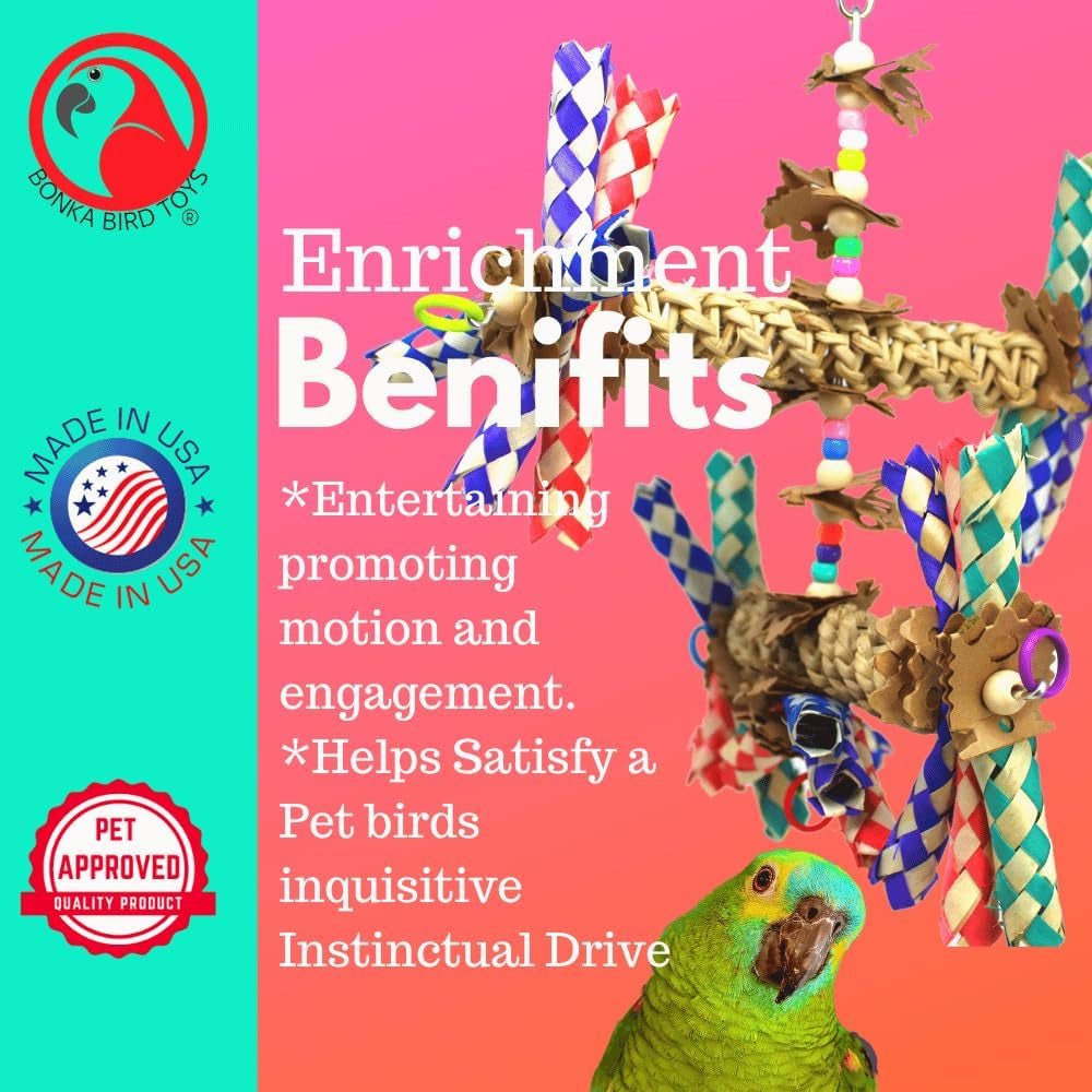 Transform your bird's playtime with the 1241 Double Helix from Bonka Bird Toys, a medium-sized bird toy meticulously designed for engaging shredding and interactive fun. This dynamic toy, adorned with colorful and varied components, promises to keep your feathered friend entertained and stimulated for hours. The Double Helix features a quick link connector at the top, ensuring fast and secure hanging in your bird's cage. Built with a sturdy metal wire as its backbone, this toy guarantees durability and stability, allowing your bird to safely explore and enjoy its features. This exciting toy is decorated with an array of cardboard shreds, colorful plastic beads, and natural wooden beads. These elements provide a variety of textures and materials for your bird to investigate, catering to their natural curiosity and chewing instincts. At the bottom and on either side, the Double Helix boasts bunches of three colorful bamboo finger traps, perfect for chewing and shredding. Natural vine ladders on two levels add complexity and fun. These components are mounted on sturdy metal wires that can be rotated, allowing you to customize the toy's shape and setup for endless play possibilities. Colorful rubber rings hang from metal loops at the ends of the bamboo finger traps, offering additional elements for your bird to pull and grab. These rings not only enhance the toy's appeal but also add an extra layer of fun and functionality. The unique design of the Double Helix enables you to adjust and experiment with various toy configurations, keeping your bird's interest piqued. This versatility ensures that each play session remains fresh and exciting, providing continuous opportunities for exploration and play. Measuring approximately 11 inches in height and 9 inches in width, and weighing under 3 ounces, the 1241 Double Helix is perfectly sized for medium birds. Crafted with 100% bird-safe materials, this toy offers a secure and enjoyable environment for your pet to play in.